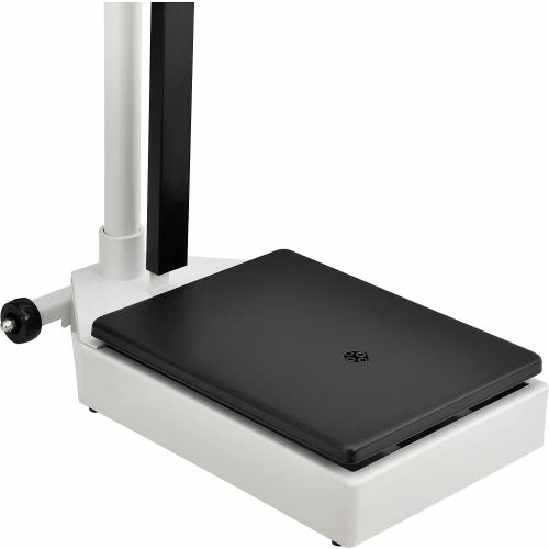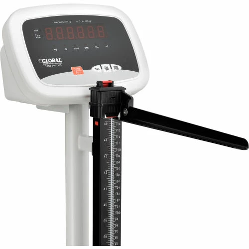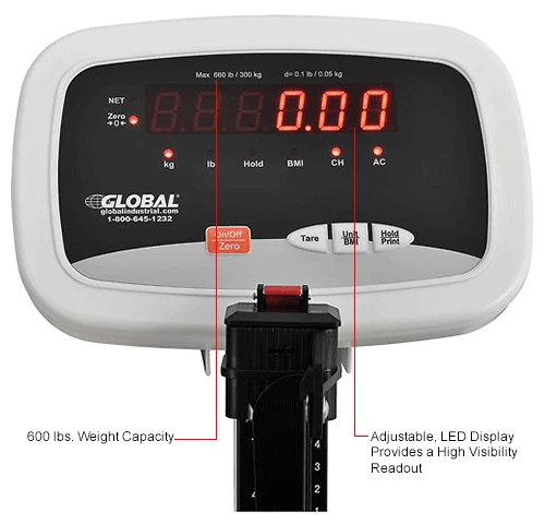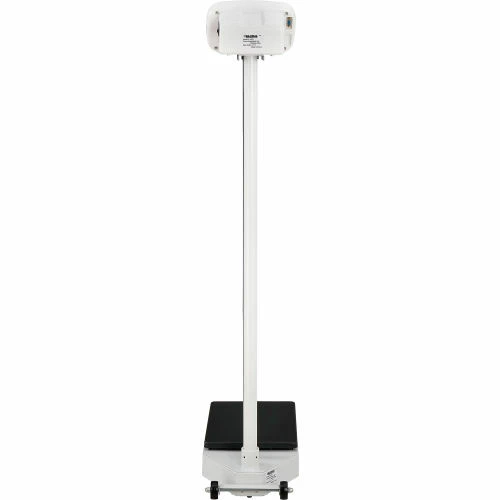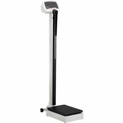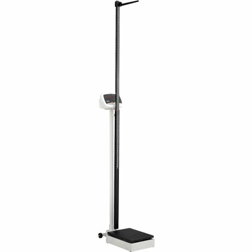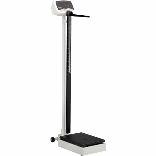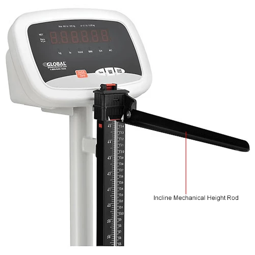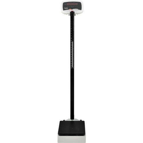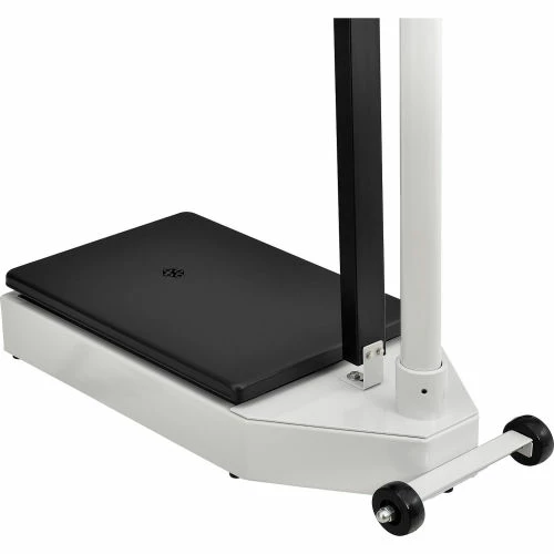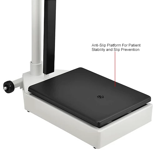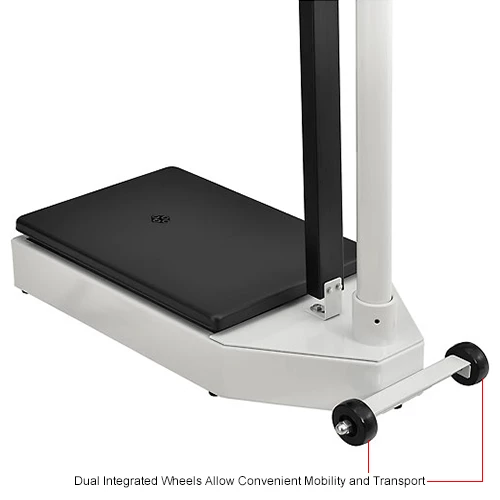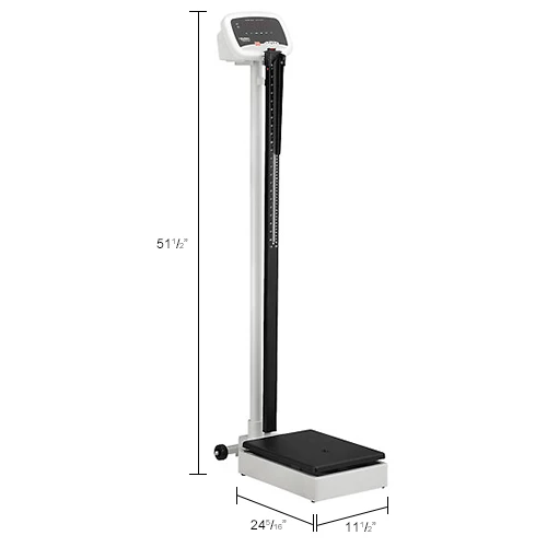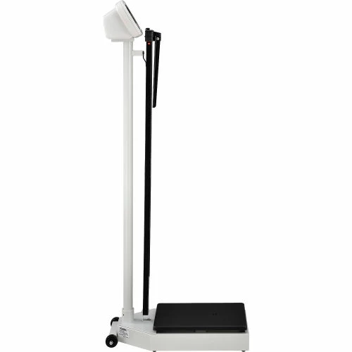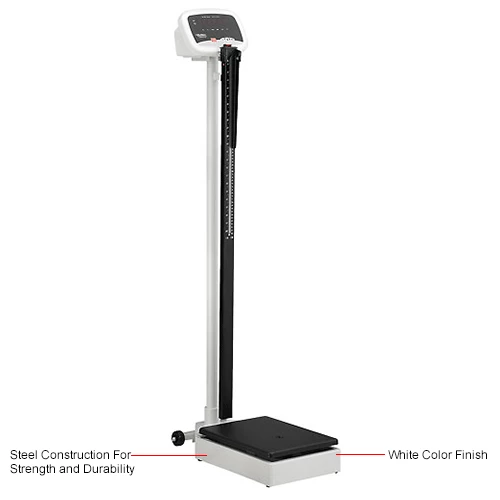 Digital physician scale is made of steel for strength and durability. Adjustable, LED display provides high visibility readout for user convenience. Anti-slip platform ensures patient stability and slip prevention. Dual integrated wheels allow ergonomic unit mobility and transport. Includes incline mechanical height rod for height measurement accuracy. Weight capacity is 600 lbs. Color finish is White. CE and UL listed. Dimensions are 11-1/2″L x 24-5/16″W x 51-1/2″H.