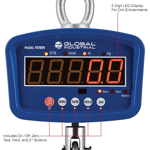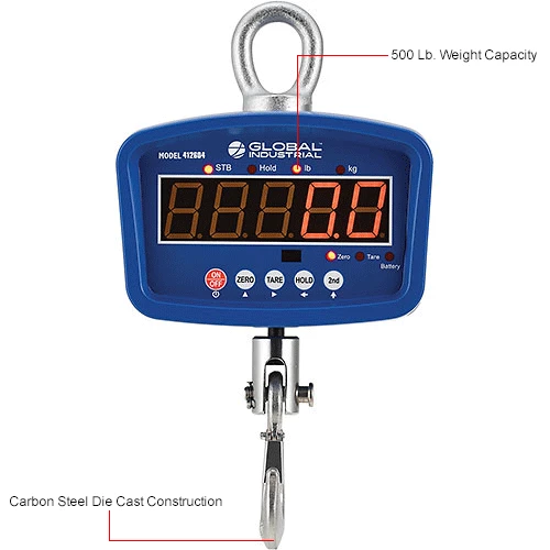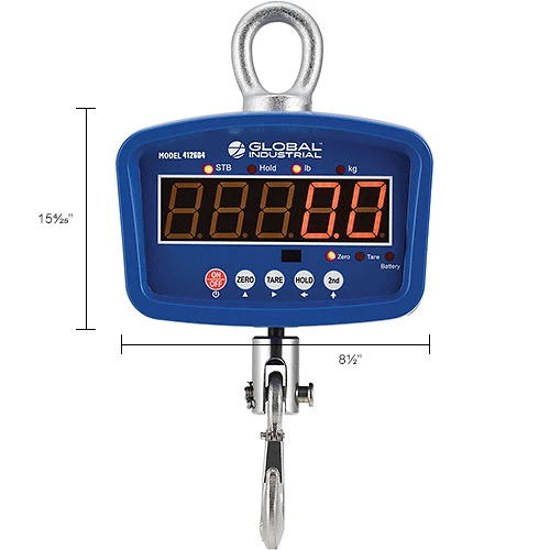Record accurate weight values with the Global Industrial™ LED Digital Crane Scale with Remote. Its durable construction makes it ideal for weighing oversized loads in a wide range of environments, including warehousing, farming, and industrial applications. This digital crane scale features an easy-to-read display that can move from load to load, unlike conventional floor scales. Allows users to change units, clear measurements, zero and tare out weight, and capture peak values from a distance. The hold function locks in the weight value after the load has been removed and can switch from pounds to kilograms for ease of use when shipping internationally. Accuracy class: III. 1 Year Limited Warranty. Measures: 5.75″ W x 8.5″ L x 15.16″ H.
