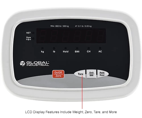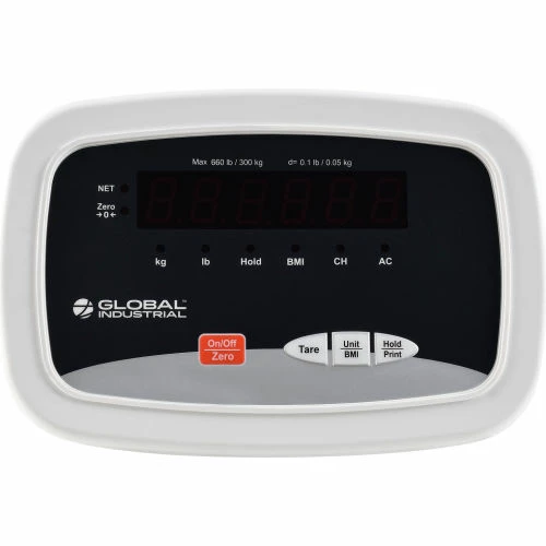 The Global Industrial™ Replacement Indicator is compatible with the Global Industrial™ Digital Physician Scale with Height Rod, model number 318503. Includes a 12V 500ma adapter, built-in lead-acid rechargeable battery, multiple hold functions, and measuring units—including zero, tare, and gross. UL and cUL certified. 1 Year Limited Warranty.
